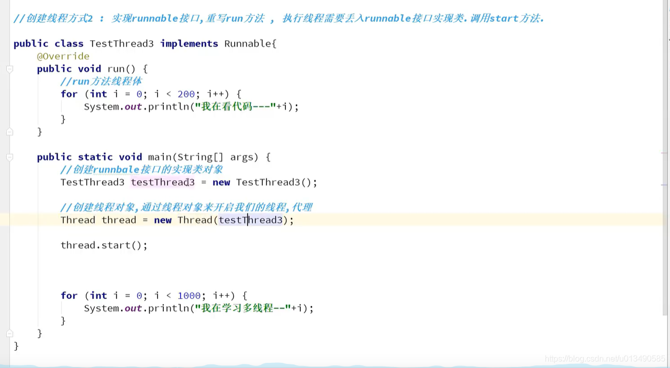 与Thread类使用方法一致,但Runnable为接口;且Runnable为任务,需要使用Thread类(线程)执行任务。