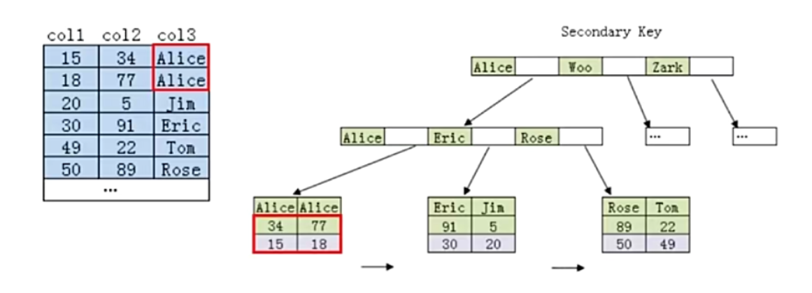 使用col3,col2,col1 顺序建立联合索引,通过col3的值建立一个btree ,通过关键值去查找“Alice”,在叶子节点中找到两个“Alice”,那么“Alice”对于col2、col1对应的值,那么会对col2,col1分别进行一个有序的排列&#x…