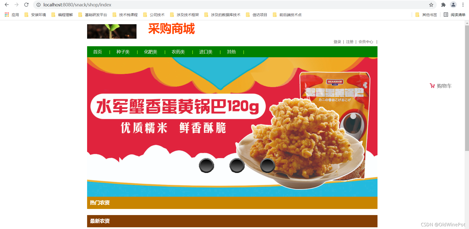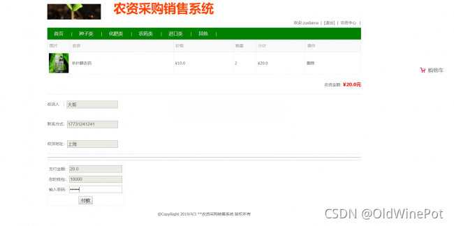 一个完整的农资采购销售系统,系统分为前台会员注册登陆,农资信息浏览,农资详情信息查看,加入购物车,提交订单,付款购买农资等;后台管理员对人员信息的管理,首页图片管理(系统可配置化),农资订单管理,图标统计,农资信息管理