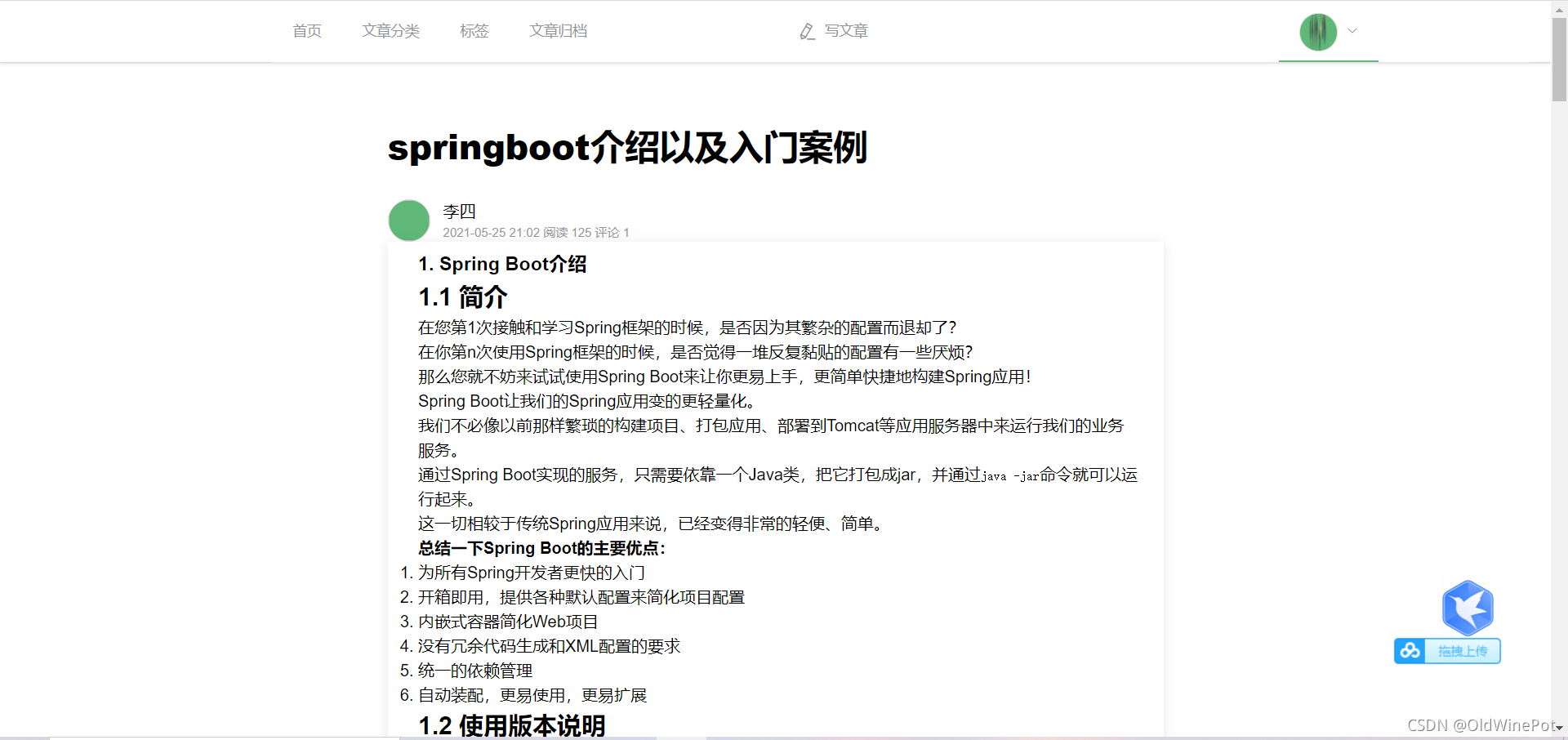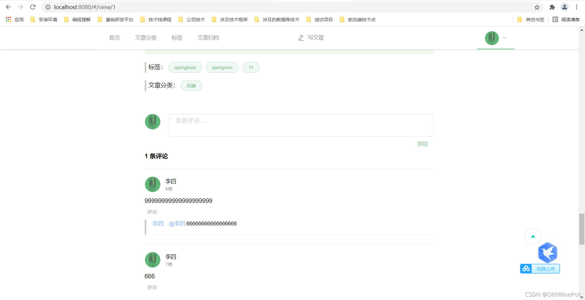 springboot+mybatis+前端vue,使用前后端分离架构实现的个人博客系统,共7个模块,首页,写博客,博客详情页,评论管理,文章分类,标签管理和文章归档。