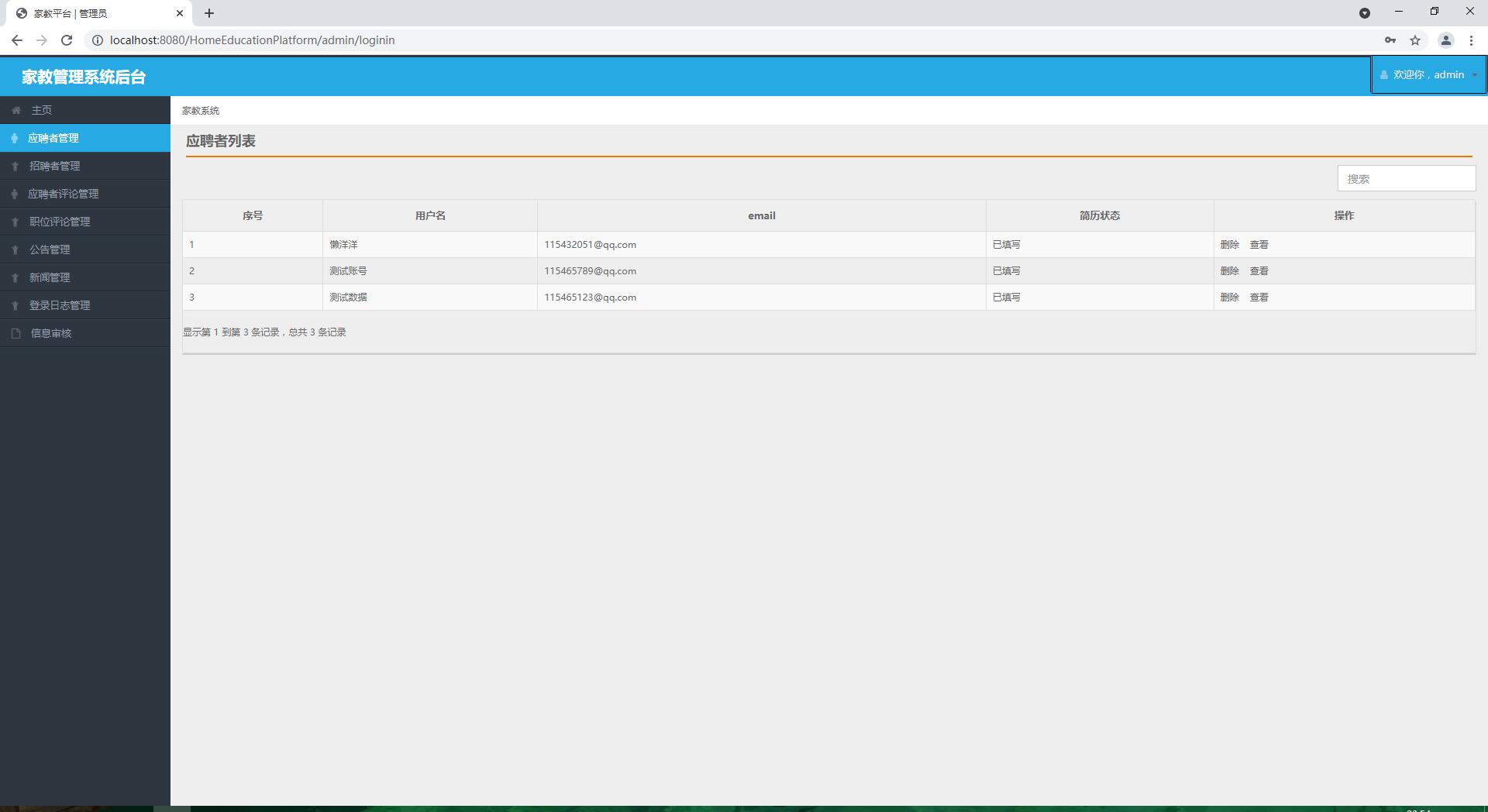 后台功能有:用户管理、学员管理、教师管理、审核管理、公告管理、新闻管理、简历管理等。前台注册分为学员和教师两个角色,学员负责找家教教师、发布需求。教师制作简历供学员选择、联系学员。类似于兼职系统。