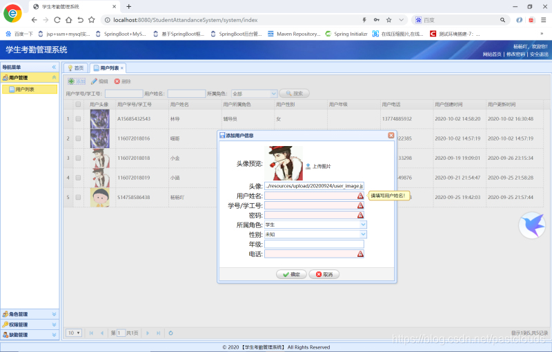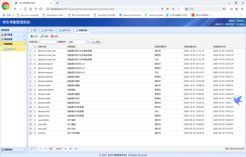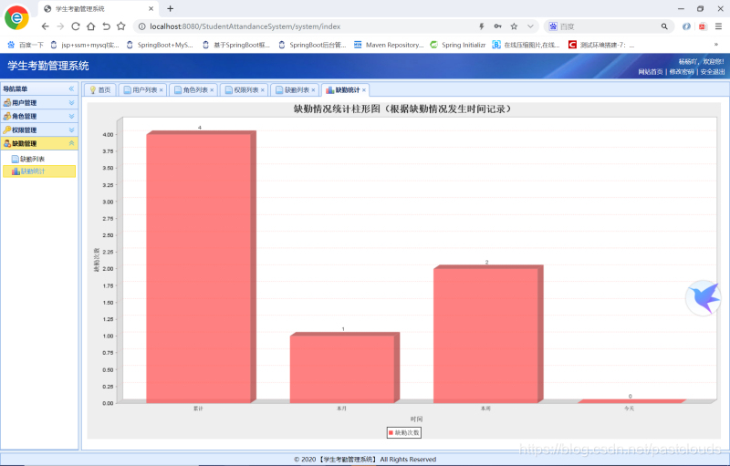 用户管理功能(登录、退出登录、增加用户、编辑用户、删除用户、多条件查询用户、上传用户头像、修改个人密码);角色管理功能(添加角色、编辑角色、删除角色、查询角色);权限管理功能(添加权限、编辑权限、删除权限、多条件查询权限);缺勤管理功能(添加缺勤、编辑缺勤、删除缺勤、多条件查询缺勤、导出Excel、柱形图显示缺勤情况)。