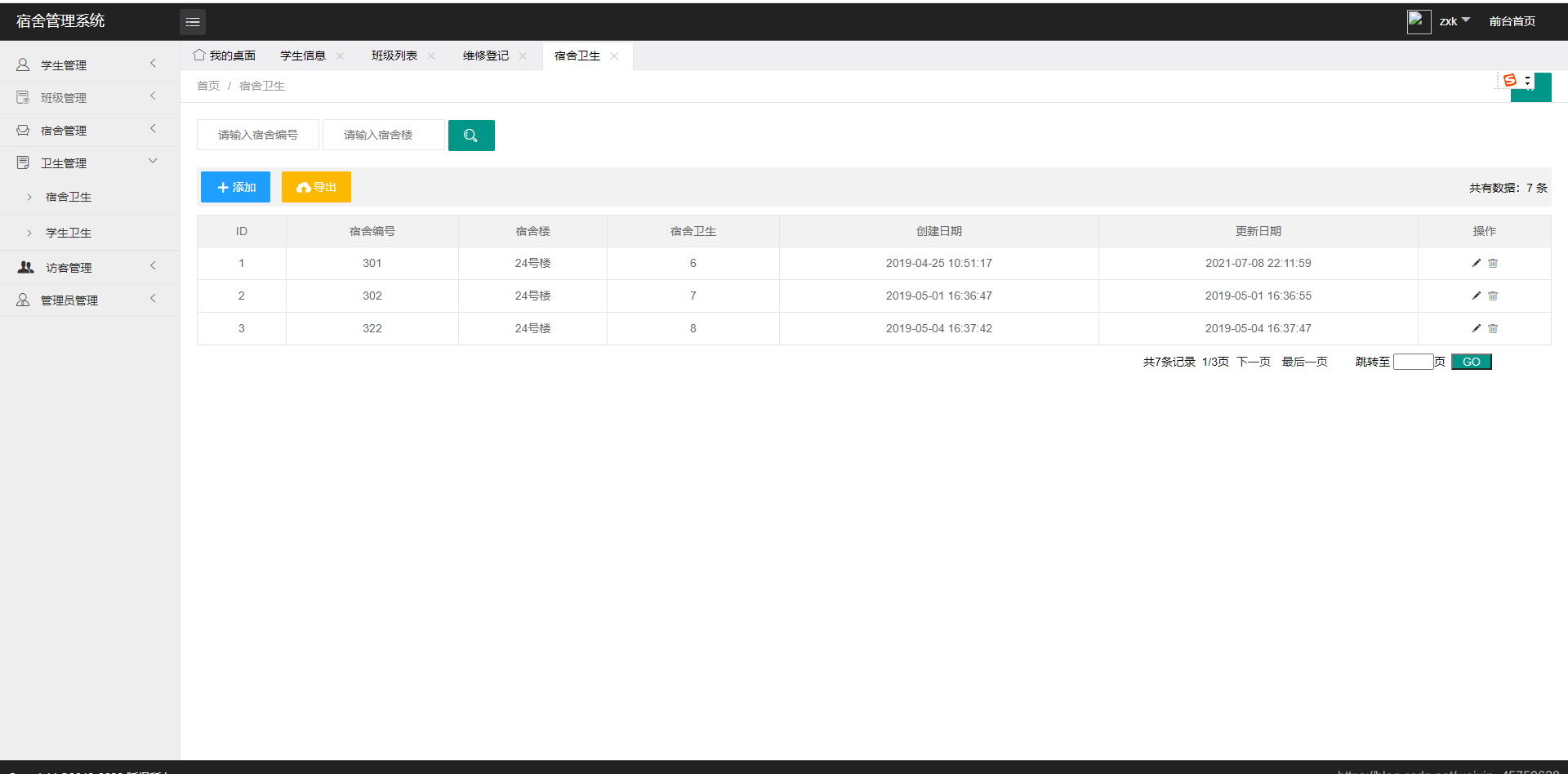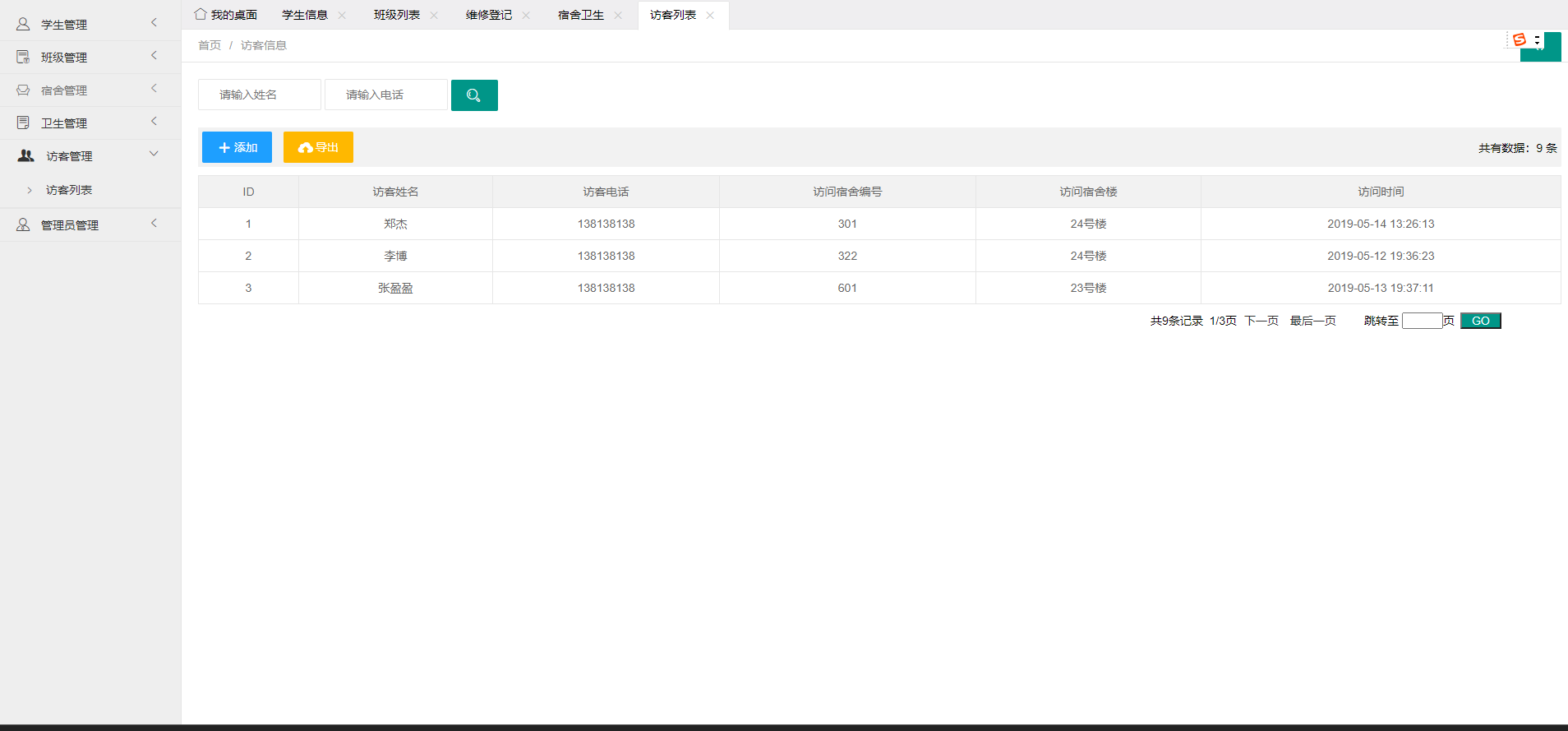 功能:包括学生管理,班级管理,宿舍管理,人员信息维 护。维修登记,卫生管理,访客管理等等。