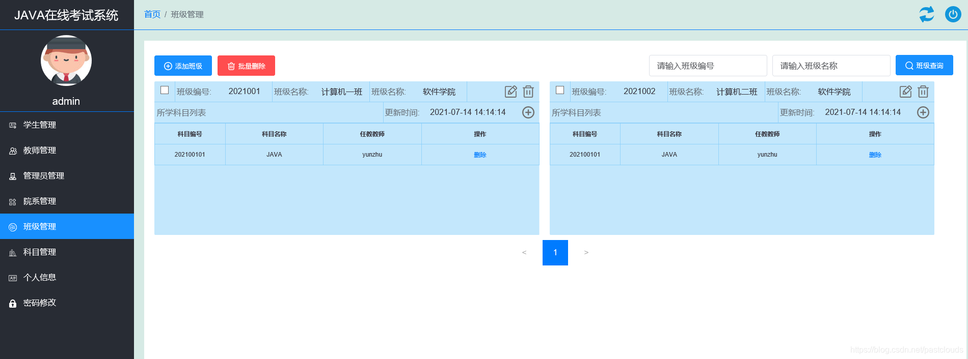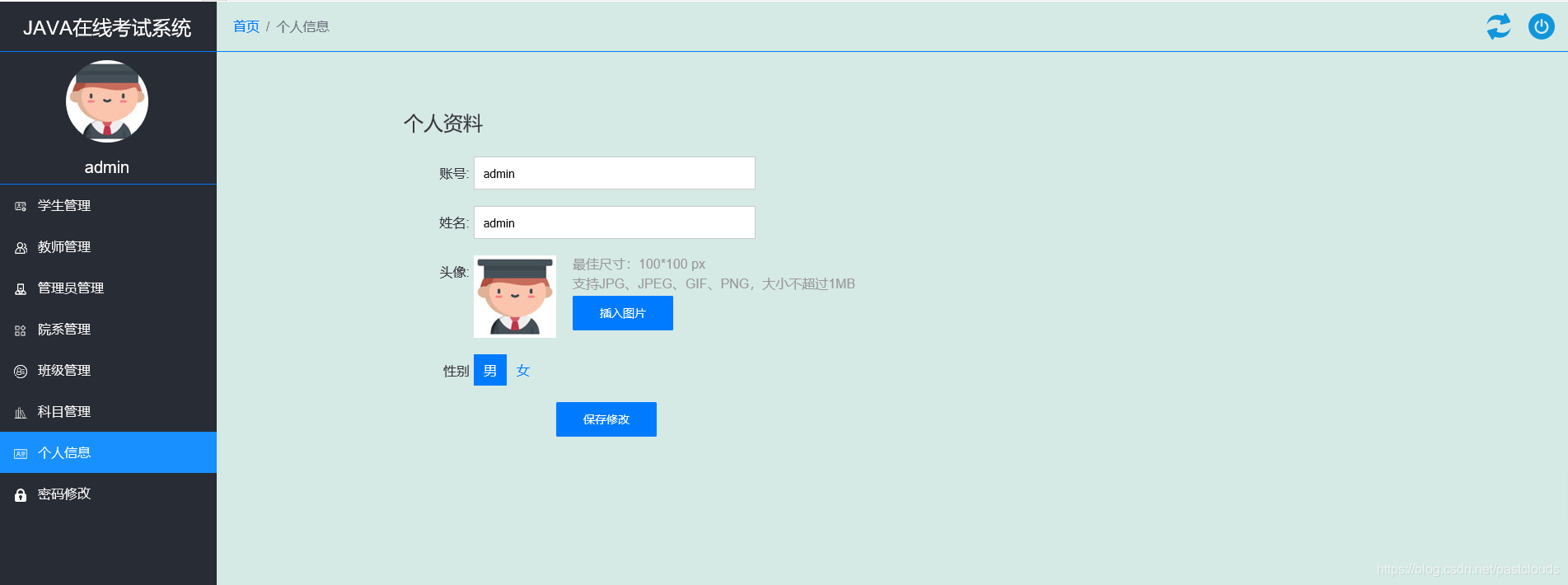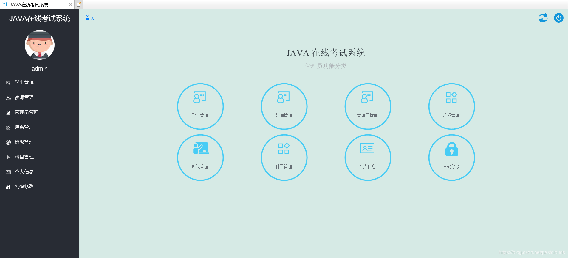 学生信息 班级 专业 学号 姓名 在线考试 成绩查询 个人信息 密码修改 教师管理 教师编号 姓名 所教科目 题库管理 单选题 多选题 填空题 判断题,简答题(人工阅卷) 试卷管理 新建试卷 在试库中选择试题 试卷设置 发布试卷 考试管理 发布考试计划 学生考试 自动阅卷 人工阅卷 个人信息 密码修改 管理员 学生管理 教师管理 管理员管理 院系管理 班级管理 个人信息 密码修改。