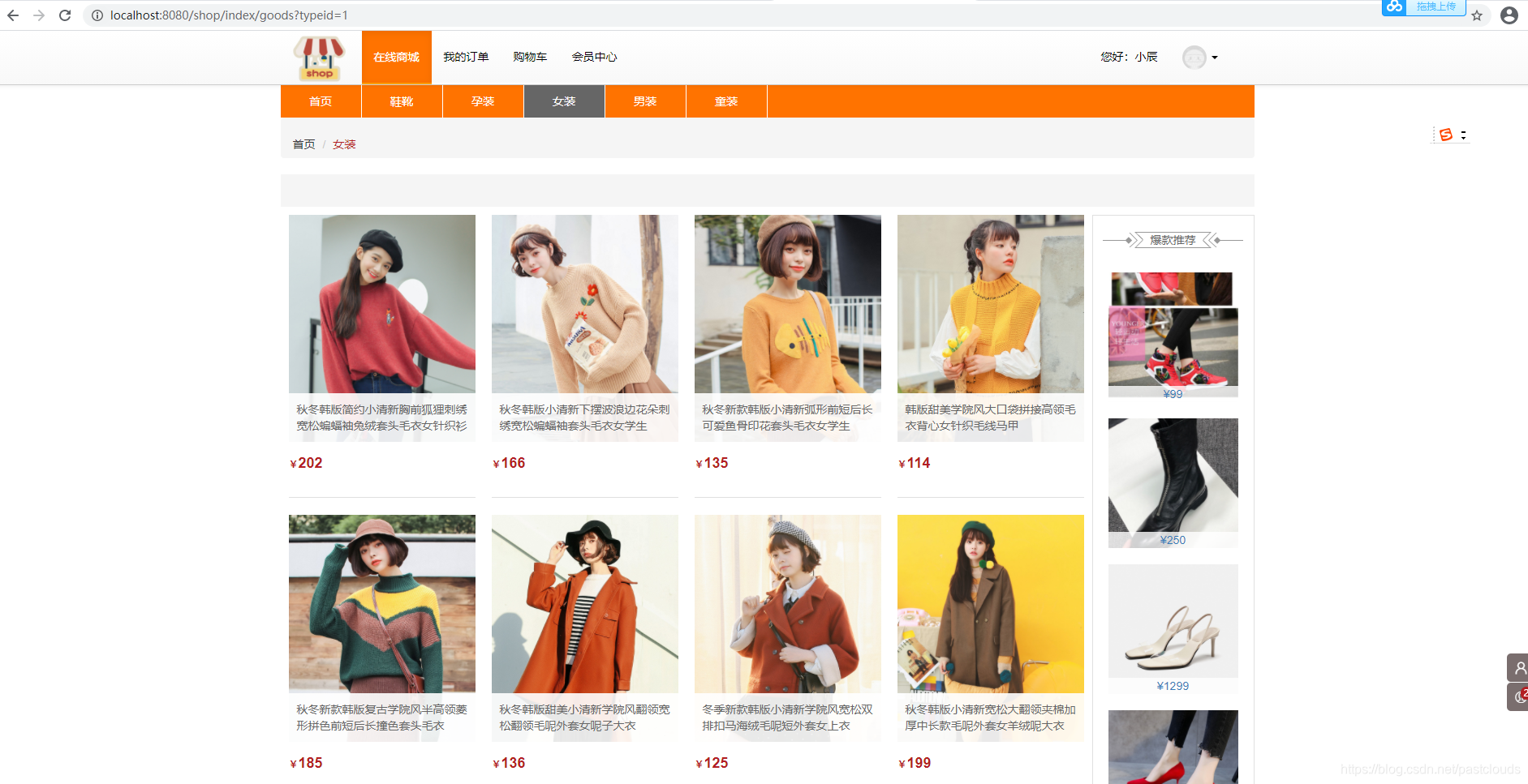 // }return orderService.save(Arrays.asList(shopcart), user);}/*** 购买* @return*/@RequestMapping("/cart")public @ResponseBody int cart(Shopcart shopcart, HttpSession session, Model model){Users user = (Users) session.getAttribute("user");if (user == null) {return -111;}shopcart.setUserId(user.getId());shopcartService.save(shopcart);int total = shopcartService.getTotal(user.getId());session.setAttribute("total", total);return total;}/*** 添加*/@RequestMapping("/add")public @ResponseBody boolean add(int skuid, HttpSession session){Users user = (Users) session.getAttribute("user");if (user == null) {return false;}return shopcartService.add(skuid);}/*** 减少*/@RequestMapping("/less")public @ResponseBody boolean less(int skuid, HttpSession session){Users user = (Users) session.getAttribute("user");if (user == null) {return false;}return shopcartService.less(skuid);}/*** 删除*/@RequestMapping("/delete")public @ResponseBody boolean delete(int skuid, HttpSession session){Users user = (Users) session.getAttribute("user");if (user == null) {return false;}shopcartService.delete(skuid);session.setAttribute("total", shopcartService.getTotal(user.getId()));return true;}/*** 总金额* @return*/@RequestMapping("/total")public @ResponseBody int total(HttpSession session){Users user = (Users) session.getAttribute("user");if (user == null) {return -111;}return shopcartService.getTotalPrice(user.getId());}/*** 提交订单* @return*/@RequestMapping("/save")public String save(ServletRequest request, HttpSession session, Model model){Users user = (Users) session.getAttribute("user");if (user == null) {model.addAttribute("msg", "请先登录!");return "/index/index";}List<Shopcart> shopcartList = shopcartService.getList(user.getId());if(Objects.isNull(shopcartList) || shopcartList.isEmpty()) {model.addAttribute("msg", "购物车没有商品");return shopcart(model, session);}// 验证库存for(Shopcart cart : shopcartList) {int stock = skuService.getStock(cart.getGoodId(), cart.getColorId(), cart.getSizeId());if(cart.getAmount() > stock) {model.addAttribute("msg", "商品 [ " + cart.getGood().getName() + " ] 库存不足! 当前库存只有: " + stock);return shopcart(model, session);}}int orderid = orderService.save(shopcartList, user);if(orderid > 0) {// 清空购物车session.setAttribute("total", shopcartService.getTotal(user.getId()));// 跳转支付return "redirect:topay?orderid="+orderid;} model.addAttribute("msg", "出了点问题");return shopcart(model, session);}/*** 支付页面* @return*/@RequestMapping("/topay")public String topay(int orderid, ServletRequest request, HttpSession session) {Users user = (Users) session.getAttribute("user");if (user == null) {request.setAttribute("msg", "请先登录!");return "/index/index";}request.setAttribute("typeList", typeService.getList());request.setAttribute("order", orderService.get(orderid));return "/index/pay.jsp";}/*** 支付(模拟)* @return*/@RequestMapping("/pay")public String pay(Orders order, ServletRequest request, HttpSession session) {Users user = (Users) session.getAttribute("user");if (user == null) {request.setAttribute("msg", "请先登录!");return "/index/index";}// 模拟支付orderService.pay(order);request.setAttribute("typeList", typeService.getList());request.setAttribute("order", orderService.get(order.getId()));request.setAttribute("msg", "支付成功! 即将跳转到订单列表");return "/index/pay.jsp";}/*** 查看订单* @return*/@RequestMapping("/order")public String order(HttpSession session, Model model){model.addAttribute("flag", 12);Users user = (Users) session.getAttribute("user");if (user == null) {model.addAttribute("msg", "请登录后查看订单!");return "/index/index";}model.addAttribute("typeList", typeService.getList());model.addAttribute("orderList", orderService.getListByUserid(user.getId()));return "/index/order.jsp";}/*** 个人信息* @return*/@RequestMapping("/my")public String my(HttpSession session, Model model){model.addAttribute("flag", 11);model.addAttribute("typeList", typeService.getList());Users user = (Users) session.getAttribute("user");if (user == null) {model.addAttribute("msg", "请先登录!");return "/index/index";}model.addAttribute("user", user);return "/index/my.jsp";}/*** 修改信息* @return*/@RequestMapping("/updateUser")public String updateUser(Users user, HttpSession session, Model model){model.addAttribute("flag", 11);model.addAttribute("typeList", typeService.getList());Users userLogin = (Users) session.getAttribute("user");if (userLogin == null) {model.addAttribute("msg", "请先登录!");return "/index/index";}// 修改资料Users u = userService.get(userLogin.getId());u.setName(user.getName());u.setPhone(user.getPhone());u.setAddress(user.getAddress());userService.update(u); // 更新数据库session.setAttribute("user", u); // 更新sessionmodel.addAttribute("msg", "信息修改成功!");return "/index/my.jsp";}/*** 修改信息* @return*/@RequestMapping("/updatePassword")public String updatePassword(Users user, HttpSession session, Model model){model.addAttribute("flag", 11);model.addAttribute("typeList", typeService.getList());Users userLogin = (Users) session.getAttribute("user");if (userLogin == null) {model.addAttribute("msg", "请先登录!");return "/index/index";}// 修改密码Users u = userService.get(userLogin.getId());if(user.getPasswordNew()!=null && !user.getPasswordNew().trim().isEmpty()) {if (user.getPassword()!=null && !user.getPassword().trim().isEmpty() && SafeUtil.encode(user.getPassword()).equals(u.getPassword())) {if (user.getPasswordNew()!=null && !user.getPasswordNew().trim().isEmpty()) {u.setPassword(SafeUtil.encode(user.getPasswordNew()));}userService.update(u); // 更新数据库session.setAttribute("user", u); // 更新sessionmodel.addAttribute("msg", "密码修改成功!");return "redirect:logout";}else {model.addAttribute("msg", "原密码错误!");}}return "/index/index";}}前台相关接口:
