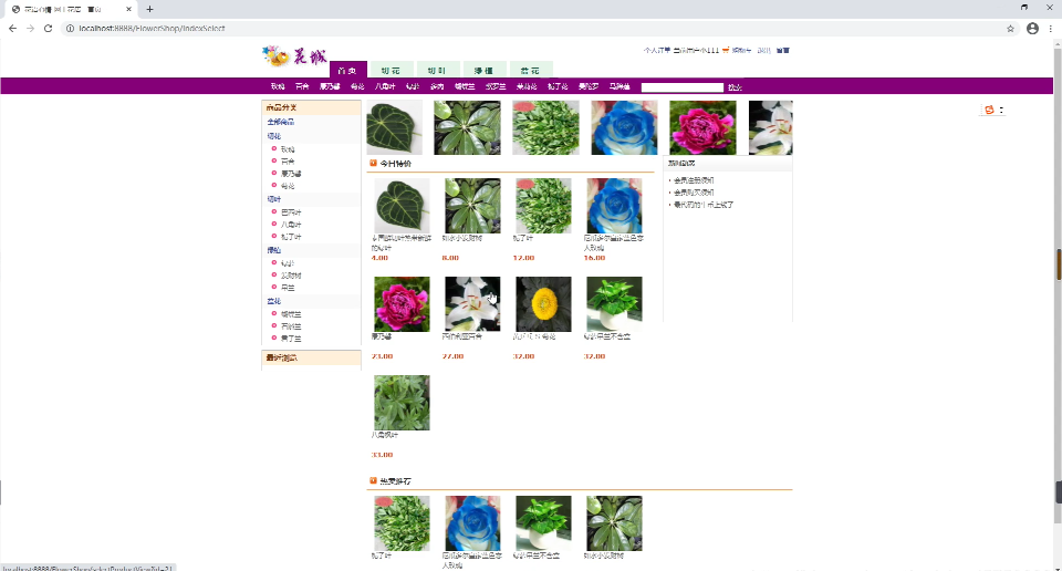 功能: 一套完整的网上花店商场系统,系统支持前台会员的注册 登陆系统留言,花朵的品种选择,详情浏览,加入购物 车,购买花朵等;后台支持管理员的花朵种类添加,花朵 详情的添加修改,用户管理,留言管理,商场新闻管理等。