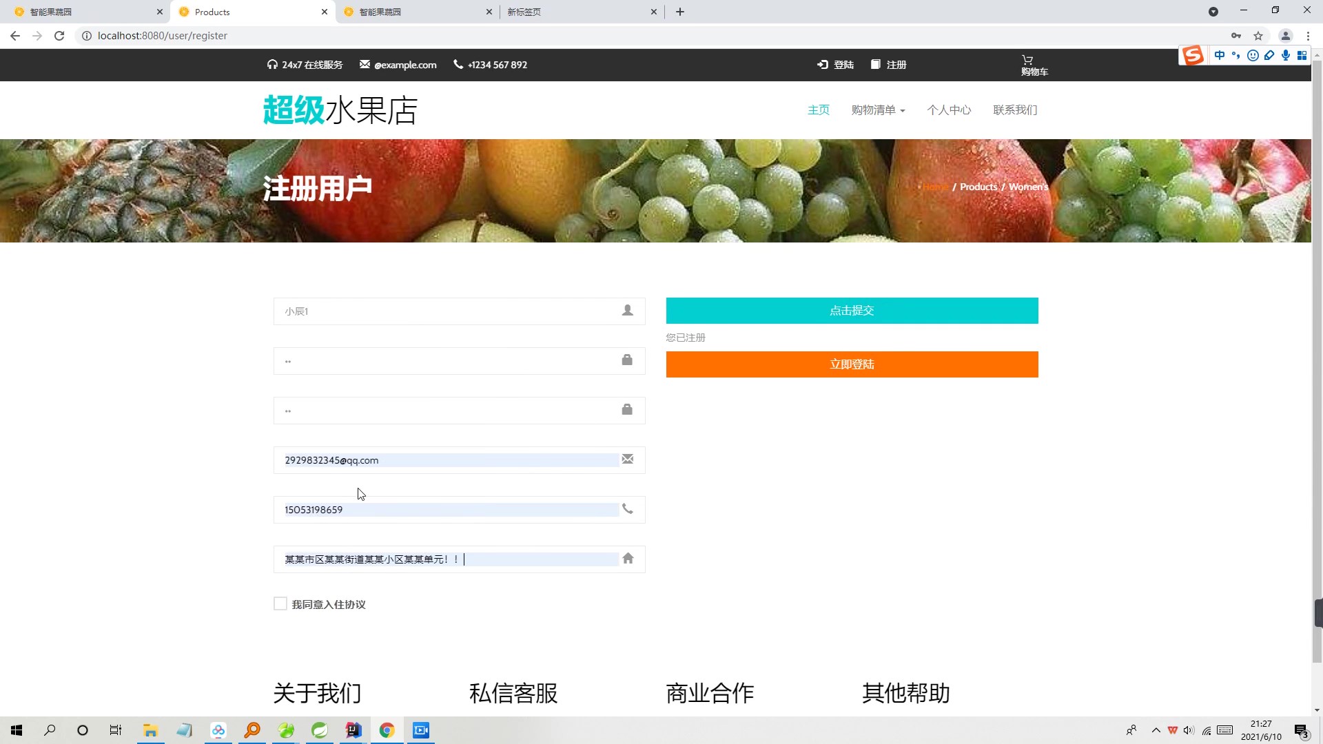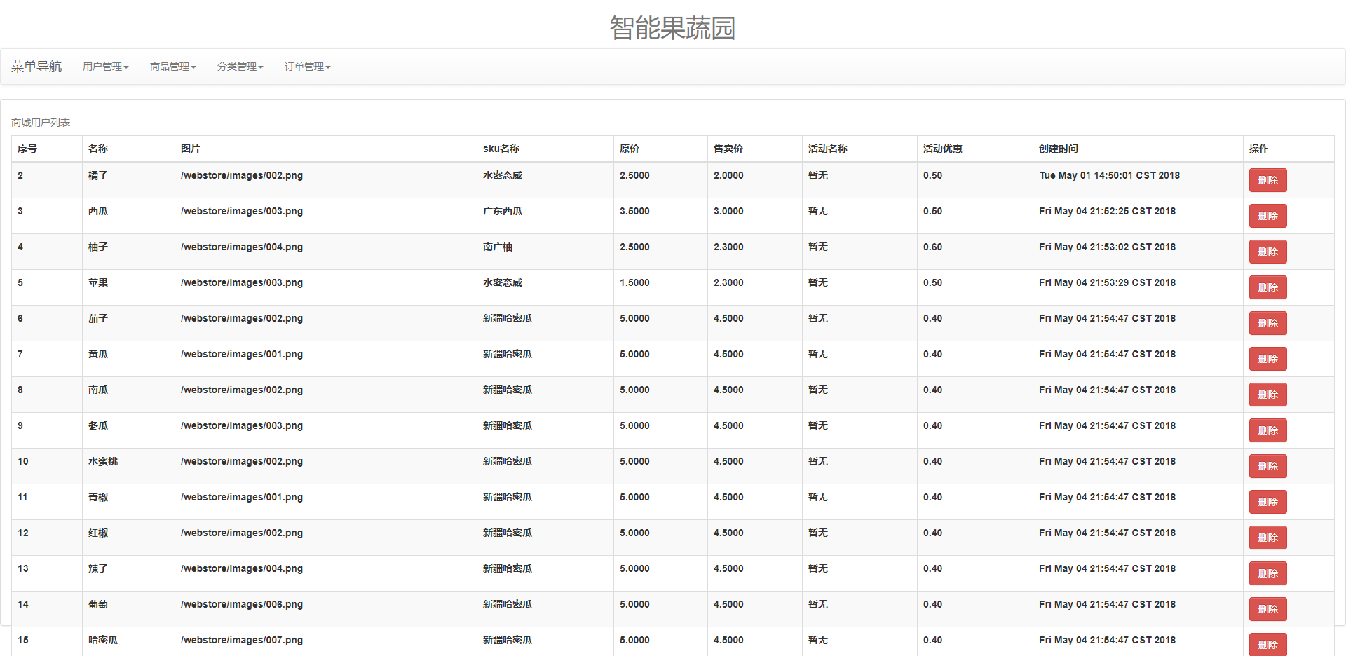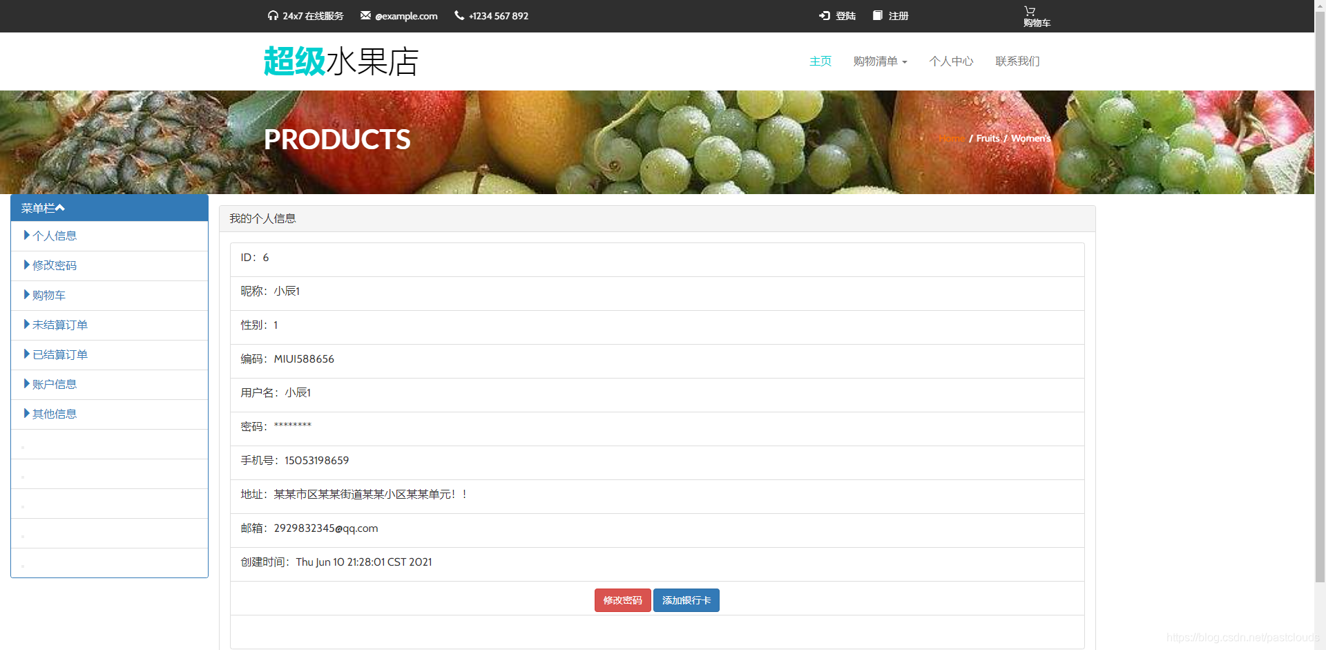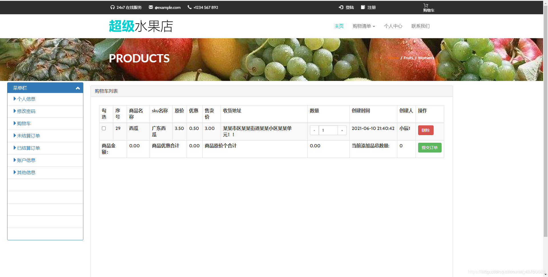 本系统主要实现的功能有: 前台用户的登录注册,水果商品的展示,水果的购物车, 购物车新增结算等等,银行卡的支付绑定,收货地址的维护,密码修改等等功能 后台管理的用户管理,商品管理,分类管理,订单管理等等。