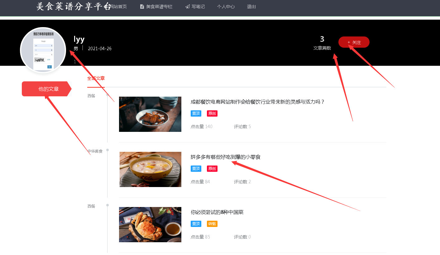 美食分享笔记详情信息查看、用户登录后可以进行评论、浏览量会增加、用户可以收藏当前文档信息、可以点击查看作者信息、可以对作者进行关注等操作: