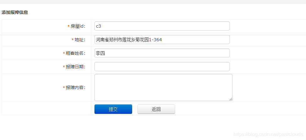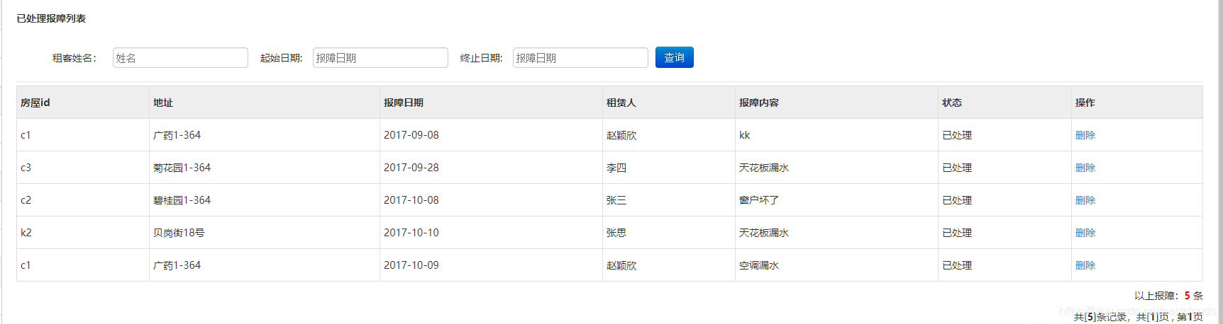 //租客查找自己已处理的报障@RequestMapping("/findmysolve")public String findmysolve(HttpSession httpSession,Model model,QueryVo vo,@RequestParam(required=false,defaultValue="1") Integer page,@RequestParam(required=false,defaultValue="6") Integer pageSize){User user1= (User) httpSession.getAttribute("user");Userlist userlist=userlistService.findhasuserlist(user1.getId());vo.setUserlist_id(userlist.getId());PageHelper.startPage(page, pageSize);List<Solve> list=solveService.selectall(vo);PageInfo<Solve> p=new PageInfo<Solve>(list);Integer count=solveService.selectcount(vo);model.addAttribute("solve", list);model.addAttribute("count", count);model.addAttribute("p", p);model.addAttribute("mainPage", "mysolve.jsp");model.addAttribute("vo", vo);return "zuke/main";}//管理员删除已处理报障记录@RequestMapping("/deletesolve")public String deletesolve(Integer id){solveService.deletesolve(id);return "redirect:selectall.action";}//zuke删除自己的已处理报障记录@RequestMapping("/zukedeletesolve")public String zukedeletesolve(Integer id){solveService.deletesolve(id);return "redirect:findmypaid.action";}//租客跳到我要报障页面@RequestMapping("/showaddwrong")public String showaddwrong(HttpSession httpSession,Model model,@RequestParam(required=false,defaultValue="1") Integer page,@RequestParam(required=false,defaultValue="6") Integer pageSize)throws Exception{User user1= (User) httpSession.getAttribute("user");Userlist userlist=userlistService.findhasuserlist(user1.getId());PageHelper.startPage(page, pageSize);List<Zulist> list=zulistService.findzulistbyuid(userlist.getId());PageInfo<Zulist> p=new PageInfo<Zulist>(list);model.addAttribute("zulist", list);model.addAttribute("p", p);model.addAttribute("mainPage", "showaddwrong.jsp");return "zuke/main";}//点击报障后跳转到添加报障信息页面@RequestMapping("/addwrong")public String addwrong(Integer id,Model model){Zulist zulist=paidService.findzukezulist(id);model.addAttribute("zulist", zulist);model.addAttribute("mainPage", "addwrong.jsp");return "zuke/main";}//添加报障信息到wrong表@RequestMapping("/insertwrong")public String insertwrong(Wrong wrong,Model model){solveService.insertwrong(wrong);model.addAttribute("error","insertwrong");return "redirect:showaddwrong.action";}//管理员查看所有未处理报障@RequestMapping("/wronglist")public String wronglist(Model model,@RequestParam(required=false,defaultValue="1") Integer page,@RequestParam(required=false,defaultValue="6") Integer pageSize){QueryVo vo=new QueryVo();PageHelper.startPage(page, pageSize);List<Wrong> list=solveService.findwrong(vo);PageInfo<Wrong> p=new PageInfo<Wrong>(list);model.addAttribute("wrong", list);model.addAttribute("p", p);model.addAttribute("mainPage", "wrong.jsp");return "admin/main1";}//租客查看自己的未处理报障@RequestMapping("/mywronglist")public String mywronglist(Model model,HttpSession httpSession,@RequestParam(required=false,defaultValue="1") Integer page,@RequestParam(required=false,defaultValue="6") Integer pageSize){User user1= (User) httpSession.getAttribute("user");Userlist userlist=userlistService.findhasuserlist(user1.getId());QueryVo vo=new QueryVo();vo.setUserlist_id(userlist.getId());PageHelper.startPage(page, pageSize);List<Wrong> list=solveService.findwrong(vo);PageInfo<Wrong> p=new PageInfo<Wrong>(list);model.addAttribute("p", p);model.addAttribute("wrong",list);model.addAttribute("mainPage", "mywrong.jsp");return "zuke/main";}//管理员处理报障@RequestMapping("/gotosolve")public String gotosolve(Integer id,Model model){Wrong wrong=solveService.findbyid(id);Solve solve=new Solve();solve.setHouse_id(wrong.getHouse_id());solve.setAddress(wrong.getAddress());solve.setDate(wrong.getDate());solve.setDetail(wrong.getDetail());solve.setName(wrong.getName());solve.setUserlist_id(wrong.getUserlist_id());solve.setStatus("已处理");solveService.gotosolve(id, solve);model.addAttribute("error", "duesucess");return "redirect:selectall.action";}