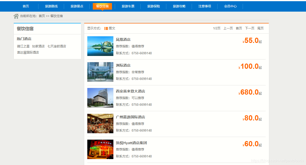 public class RecomTravelController {@Autowiredprivate ScenicService scenicService;@Autowiredprivate ScenicDao scenicDao;@Autowiredprivate HotelService hotelService;@Autowiredprivate HotelDao hotelDao;/***查询星级* @return*/@ResponseBody@RequestMapping(value = "/star",method = RequestMethod.POST)public Result judgeStar(String id,String start){System.out.println(id+"===="+start);Optional<Scenic> s = scenicDao.findById(id);if (s.isPresent()){Scenic scenic = s.get();int valuestar = (Integer.valueOf(start)+Integer.valueOf(scenic.getStart()))/2;scenic.setStart(valuestar);scenicDao.save(scenic);System.out.println("数据不为空!");return new Result(true,1,"","");}else {System.out.println("数据为空!");return new Result(false,0,"","");}}/***查询星级* @return*/@ResponseBody@RequestMapping(value = "/hotel",method = RequestMethod.POST)public Result judgeHotelStar(Long id,String start){Hotel scenic = hotelService.findById(id);if (scenic!=null){int valuestar = (Integer.valueOf(start)+Integer.valueOf(scenic.getStar()))/2;scenic.setStar(valuestar);hotelDao.save(scenic);System.out.println("数据不为空!");return new Result(true,1,"","");}else {System.out.println("数据为空!");return new Result(false,0,"","");}}/*** 查询单个景点* @param model* @param id* @return*/@RequestMapping("/oneAttr")public String One_attr(Model model,Long id){Scenic scenic=scenicService.findById(id);model.addAttribute("oneAttr",scenic);return "page/product";}/*** 景点模糊查询分页* @param model* @param start* @param limit* @param search_key* @return*/@RequestMapping("/search_attrs")public String search_attrs(Model model,@RequestParam(value = "start" ,defaultValue = "0")Integer start,@RequestParam(value = "limit" ,defaultValue = "6")Integer limit,@RequestParam String search_key){start=start<0?0:start;Sort sort=new Sort(Sort.Direction.DESC,"id");Pageable pageable=PageRequest.of(start,limit,sort);Specification specification=new Specification() {@Overridepublic Predicate toPredicate(Root root, CriteriaQuery criteriaQuery, CriteriaBuilder criteriaBuilder) {List<Predicate> scenics=new ArrayList<>();if (StringUtils.isNotBlank(search_key)){scenics.add( criteriaBuilder.like(root.get("name"),"%"+search_key+"%"));}return criteriaBuilder.and(scenics.toArray(new Predicate[scenics.size()]));}};Page<Scenic> page=scenicDao.findAll(specification,pageable);model.addAttribute("name",search_key);model.addAttribute("attrs",page);model.addAttribute("number",page.getNumber());model.addAttribute("numberOfElements",page.getNumberOfElements());model.addAttribute("size",page.getSize());model.addAttribute("totalElements",page.getTotalElements());model.addAttribute("totalPages",page.getTotalPages());model.addAttribute("first",page.isFirst());model.addAttribute("last",page.isLast());return "page/travel";}@RequestMapping("/local")public String localRefresh(Model model,Long id) {Scenic scenic=scenicService.findById(id);System.out.println(scenic.toString());List<Hotel> hotels=hotelService.findByCountryLike(scenic.getContry());Collections.sort(hotels, new Comparator<Hotel>() {@Overridepublic int compare(Hotel o1, Hotel o2) {if (o1.getStar()<o2.getStar()){return 2;}if (o1.getStar().equals(o2.getStar()) ){return 1;}return -1;}});if (hotels.size()>=4){List newList=hotels.subList(0,3);model.addAttribute("scenics",newList);System.out.println("个数:"+newList.size());}else {model.addAttribute("scenics",hotels);System.out.println("个数2:"+hotels.size());}return "page/product::table_refresh";}}