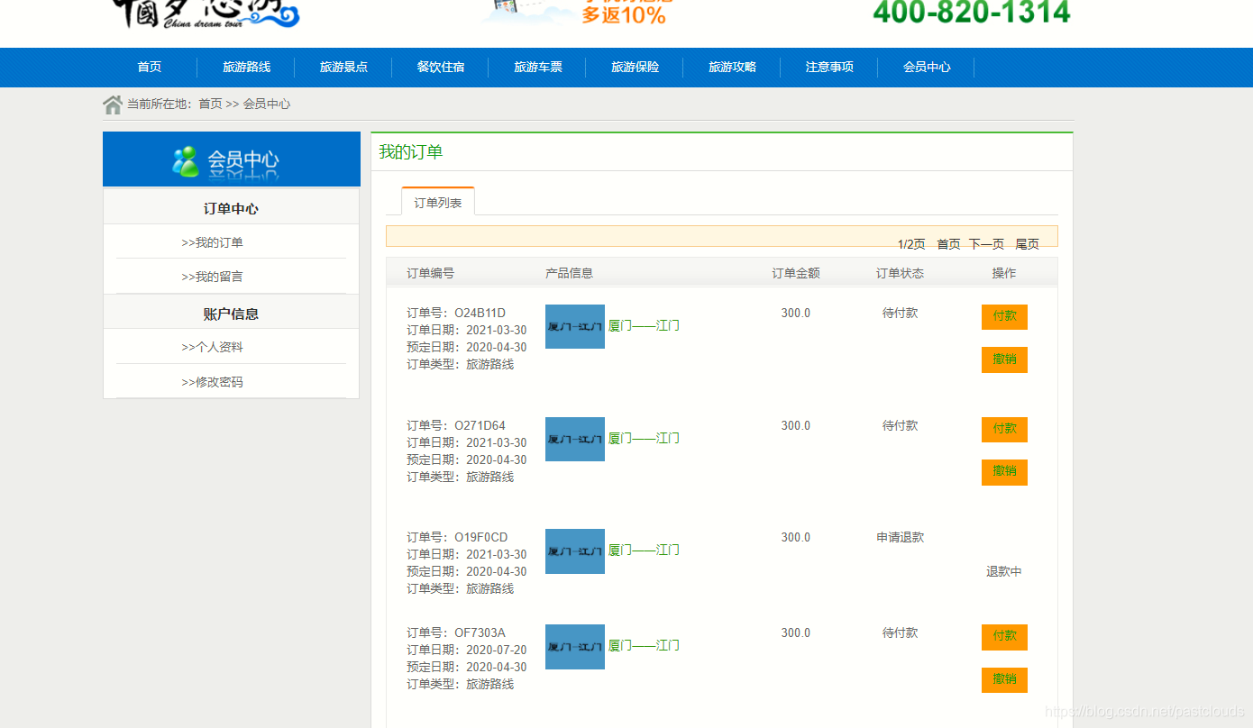 旅游景点查看和预订等、预订完成在我的订单查看付款