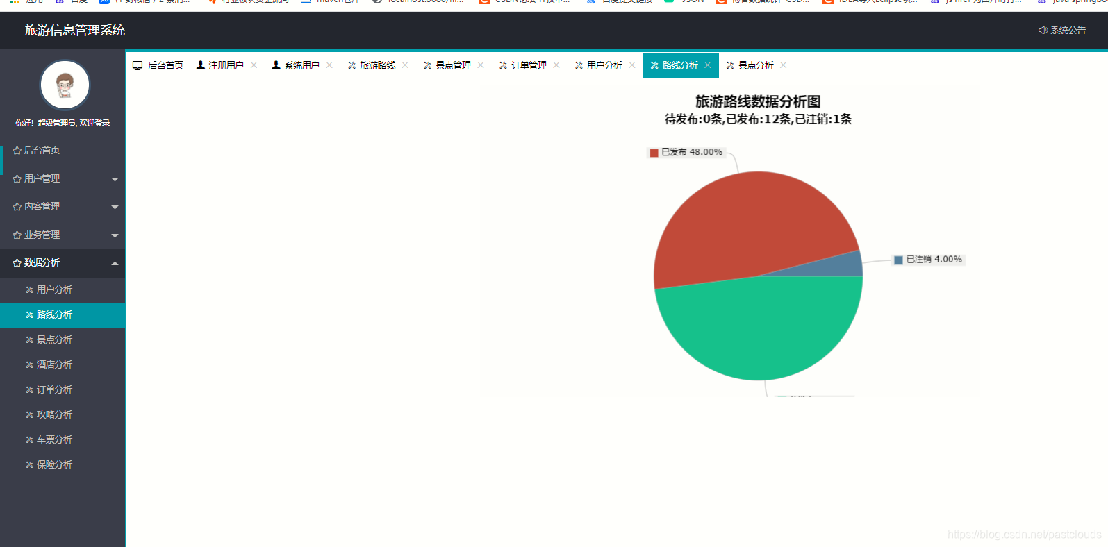 管理员角色包含以下功能:管理员登录,用户管理,旅游路线管理,旅游景点管理,酒店管理,旅游攻略管理,车票管理,订单管理,数据分析等功能。