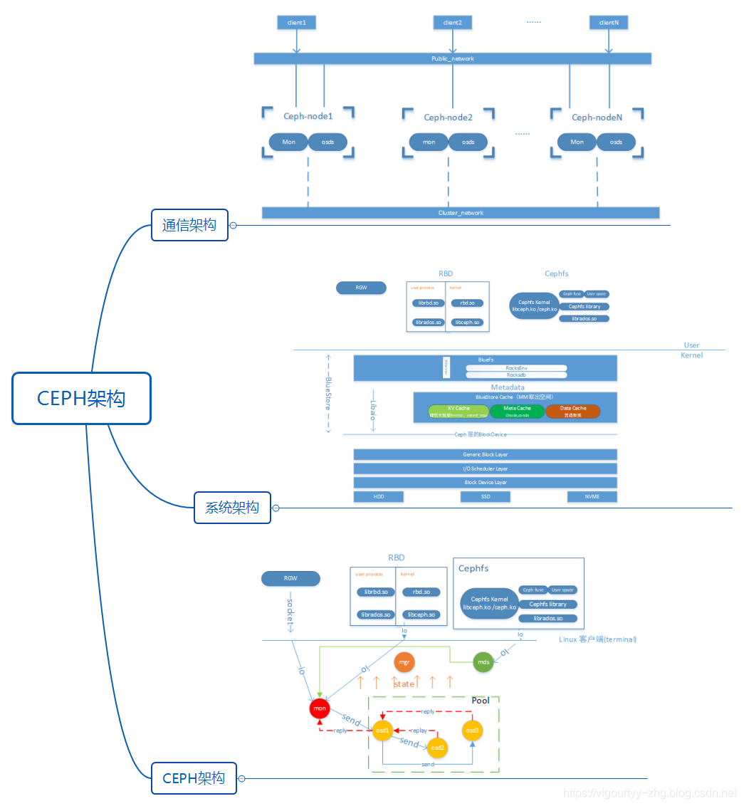 围绕分布式存储(ceph)绘制的技能图谱可参考分布式存储ceph 技能图谱 相关的原始编辑文件可以从github-mindMapping下载 如有缺失、不足之处欢迎指正 CEPH架构 关于系统架构,这里主要是将CEPH融入操作系统架构之中 且是根据L版本进行绘制的 关于文件系统 ࿱…