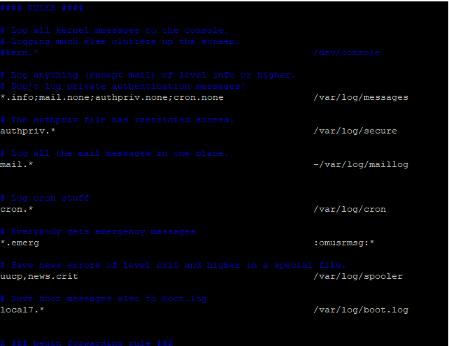 /etc/rsyslog.conf的#### RULES ####部分包含定义日志消息保存位置的配置。每行左侧表示 类别.级别。*是通配符,代表所有类别和所有级别。每行右侧表示日志保存到的文件。rsyslog的日志可能会出现在多个不同的日志文件中。为了避免这种重复,可以将级别设置为none,那么表示重定向到这个日志文件的日志消息不被记录。