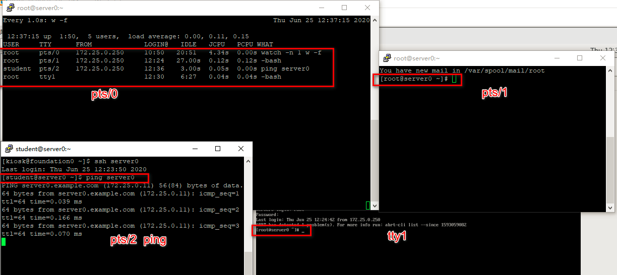 所有用户都有一个控制终端,其列为pts/N(在图形环境窗口(伪终端)中操作时),而通过系统控制台、替代控制台或其他直接连接的终端设备操作时则列为ttyN。使用 w -f 选项时,远程用户在FROM列中显示其连接系统名称。如图,共有3个终端以root身份登录server0和一个终端以student身份登录server0,就有了pts/0、pts/1、pts/2和tty1。还可以看到是什么时间登录、空闲多久、shell执行的是什么命令。