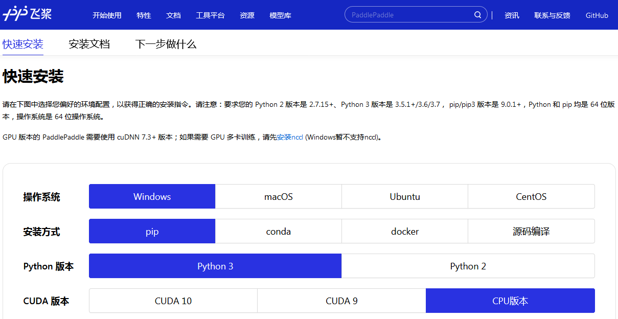 PaddlePaddle快速安装里面也有和PyTorch一样的比较人性化的设计,选择你所处的环境,生成相应的安装文档。截止到写这篇博客的时候,PaddlePaddle对环境的要求如:要求您的 Python 2 版本是 2.7.15+、Python 3 版本是 3.5.1+/3.6/3.7, pip/pip3 版本是 9.0.1+,Python 和 pip 均是 64 位版本,操作系统是 64 位操作系统。