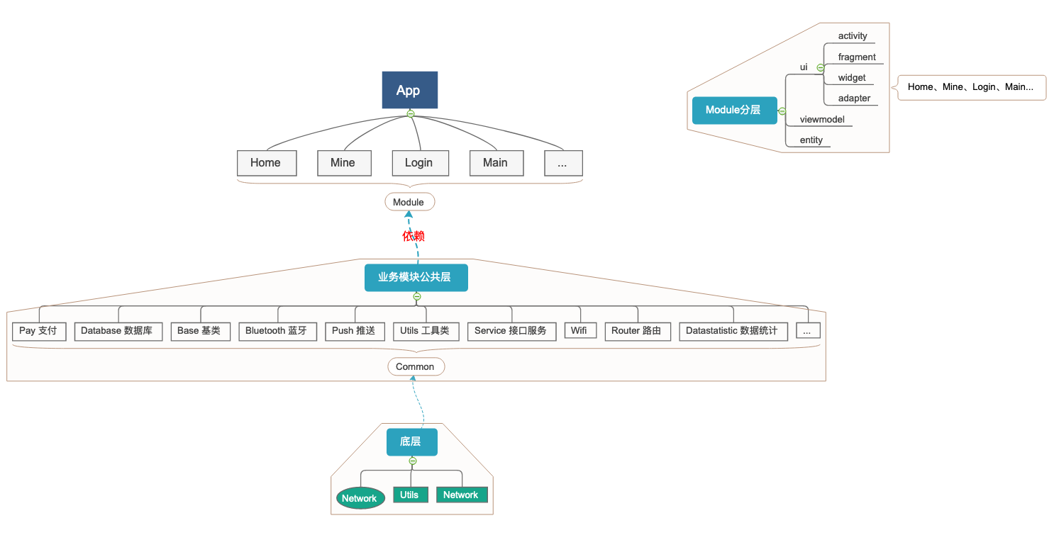 Android架构篇-1 项目组织架构 模块化分层 1.结构清晰,各模块代码分离,符合高内聚低耦合,快速定位查找代码 2.团队协作开发灵活,互不影响,各模块完成后合并即可完成整体app 3.抽离公共层、模块层、业务层,方便维护管理 分层架构图 App下的Home(首页)、Mine(我的)、Log…