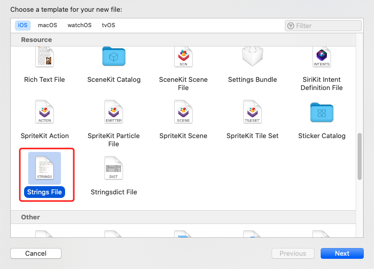 2.1 File -> New -> File...,文件名为Localizable.strings,后面需要用到文件名