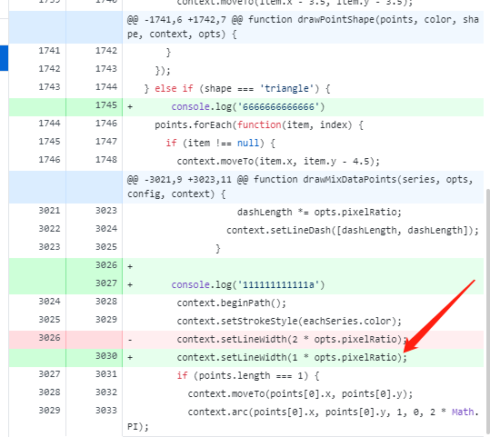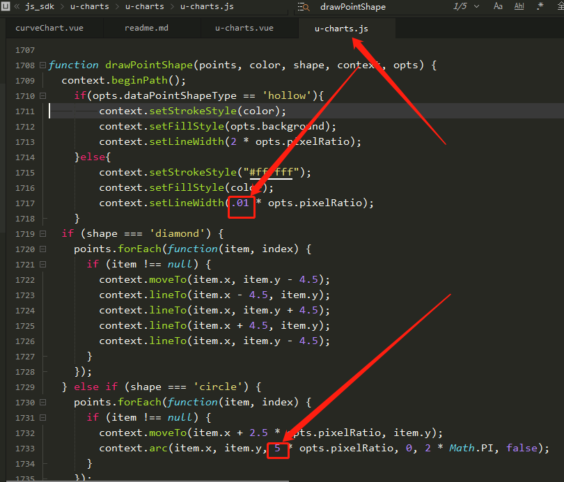 修改源码,找到u-charts.js , 修改他画布的点的大小,在这两行框的地方,改了就好了