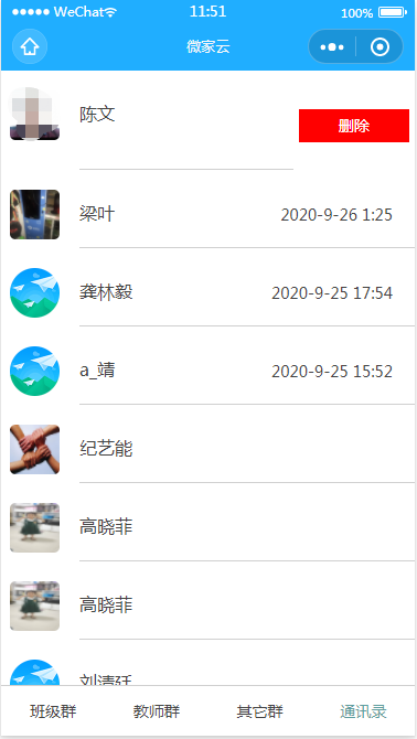 //手指刚放到屏幕触发touchS:function(e){console.log("touchS"+e);//判断是否只有一个触摸点if(e.touches.length==1){this.setData({//记录触摸起始位置的X坐标startX:e.touches[0].clientX});}},//触摸时触发,手指在屏幕上每移动一次,触发一次touchM:function(e){console.log("touchM:"+e);var that = thisif(e.touches.length==1){//记录触摸点位置的X坐标var moveX = e.touches[0].clientX;//计算手指起始点的X坐标与当前触摸点的X坐标的差值var disX = that.data.startX - moveX;//delBtnWidth 为右侧按钮区域的宽度var delBtnWidth = that.data.delBtnWidth;var txtStyle = "";if(disX == 0 || disX < 0){//如果移动距离小于等于0,文本层位置不变txtStyle = "left:0px";}else if(disX > 0 ){//移动距离大于0,文本层left值等于手指移动距离txtStyle = "left:-"+disX+"px";if(disX>=delBtnWidth){//控制手指移动距离最大值为删除按钮的宽度txtStyle = "left:-"+delBtnWidth+"px";}}//获取手指触摸的是哪一个itemvar index = e.currentTarget.dataset.index;var list = that.data.friends;//将拼接好的样式设置到当前item中list[index].txtStyle = txtStyle; list.forEach(item=>item.delShow=false)list[index].delShow = true; //更新列表的状态this.setData({friends:list});}},touchE:function(e){console.log("touchE"+e);var that = thisif(e.changedTouches.length==1){//手指移动结束后触摸点位置的X坐标var endX = e.changedTouches[0].clientX;//触摸开始与结束,手指移动的距离var disX = that.data.startX - endX;var delBtnWidth = that.data.delBtnWidth;//如果距离小于删除按钮的1/2,不显示删除按钮var txtStyle = disX > delBtnWidth/2 ? "left:-"+delBtnWidth+"px":"left:0px";//获取手指触摸的是哪一项var index = e.currentTarget.dataset.index;var list = that.data.friends;list[index].txtStyle = txtStyle; //更新列表的状态that.setData({friends:list});}},css (样式部分可用自己的,这里仅供参考)