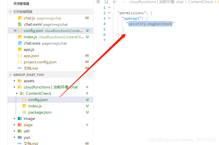 3.在ContentCheck 的 config.json 中 配置 security.msgSecCheck