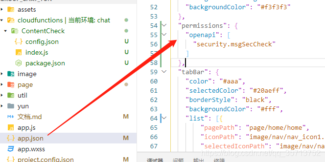 exports.main = async (event, context) => {return await cloud.openapi.security.msgSecCheck({content:event.txt})}5.在小程序 app.json 添加配置
