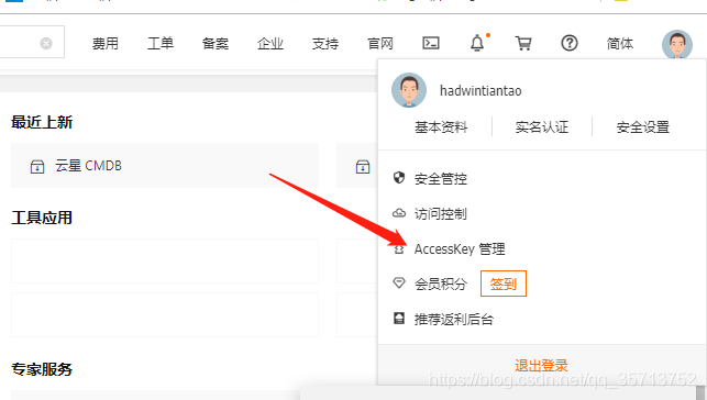 2., 登录阿里云,鼠标放在右上角的头像图标就会显示 AccessKey 管理,在里面找到你的 AccessKey ID 和 AccessKey Secret ,没有的话创建一个。