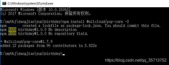 3.创建云函数,右键点击云函数,选择在终端打开,然后在 cmd 执行 npm install @alicloud/pop-core -S 命令,安装短信的node.js SDK 。