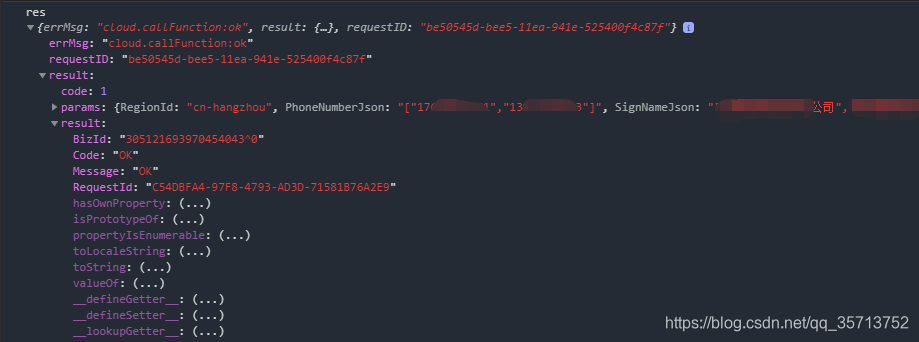 onLoad(){console.log('000')wx.cloud.callFunction({name: "birthday",success(res) {console.log('res',res)},fail(err){console.log('err',err)}})},调用后打印结果如图说明发送短信成功了: