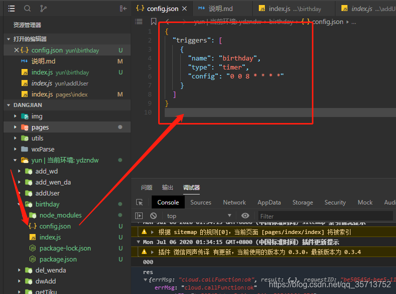 6.发送短信成功了,最后写定时器,规定每天上午8点自动执行一次该函数,在云函数的 config.json 文件添加 triggers,代码: