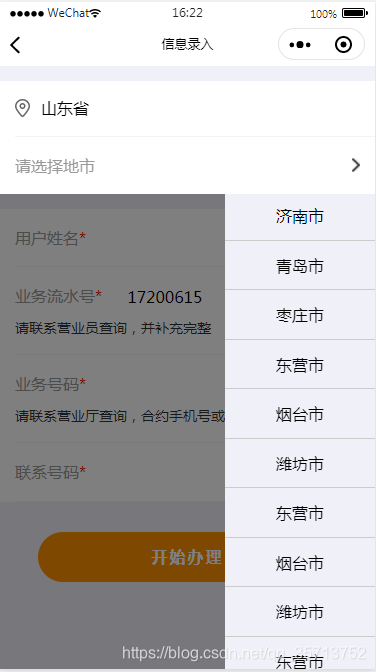 Page({data: {tipsTxt: "请填写正确的业务流水号",showTips: false,showCityList:false,city:"",cityList:["济南市","青岛市","枣庄市","东营市","烟台市","潍坊市","东营市","烟台市","潍坊市","东营市","烟台市","潍坊市","济宁市","泰安市","威海市","週博市"]},/*** 生命周期函数--监听页面加载*/onLoad: function (options) {// this.set_showTips();},show_city_list(){this.setData({showCityList:true})},num_input(e){console.log('e',e.detail.value)},select_item(e){this.setData({city:e.target.id,showCityList:false})},set_showTips() {this.setData({showTips: true})setTimeout(() => {this.setData({showTips: false})}, 1500);},nav_leaset() {wx.navigateTo({url: '../lease/lease',})},
