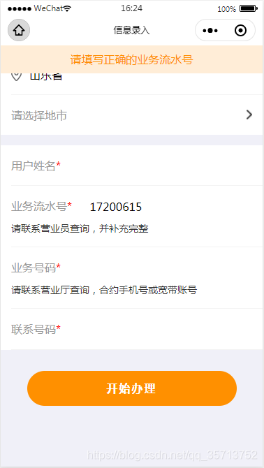 </view><view class="block"><view class="item "><view class="title p_r">用户姓名 <text>*</text> <input class="serrialNumber" value=""></input></view></view><view class="item"><view class="title p_r">业务流水号 <text>*</text> <input type="number" class="serrialNumber" value="17200615"></input></view><view class="detail">请联系营业员查询,并补充完整</view></view><view class="item"><view class="title p_r">业务号码 <text>*</text> <input type="number" class="serrialNumber" value=""></input></view><view class="detail">请联系营业厅查询,合约手机号或宽带账号</view></view><view class="item "><view class="title p_r">联系号码 <text>*</text> <input type="number" bindinput="num_input" class="serrialNumber" value=""></input></view></view>