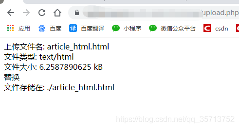 <?phpheader("Content-Type:text/html;charset=utf8"); header("Access-Control-Allow-Origin: *"); //解决跨域header('Access-Control-Allow-Methods:POST');// 响应类型 header("Content-Type:text/html;charset=utf8");if ($_FILES["file"]["error"] > 0){echo "错误:" . $_FILES["file"]["error"] . "<br>";}else{echo "上传文件名: " . $_FILES["file"]["name"] . "<br>";echo "文件类型: " . $_FILES["file"]["type"] . "<br>";echo "文件大小: " . ($_FILES["file"]["size"] / 1024) . " kB<br>"; // 如果 upload 目录不存在该文件则将文件// 判断当前目录下的 upload 目录是否存在该文件// 如果没有 upload 目录,你需要创建它,upload 目录权限为 777if (file_exists("./" . $_FILES["file"]["name"])){echo "替换 " . "<br>";unlink ( 'article_html.html' );// 如果 upload 目录不存在该文件则将文件上传到 upload 目录下move_uploaded_file($_FILES["file"]["tmp_name"], "./" . $_FILES["file"]["name"]);echo "文件存储在: " . "./" . $_FILES["file"]["name"];}else{// 如果 upload 目录不存在该文件则将文件上传到 upload 目录下move_uploaded_file($_FILES["file"]["tmp_name"], "./" . $_FILES["file"]["name"]);echo "文件存储在: " . "./" . $_FILES["file"]["name"];}}
