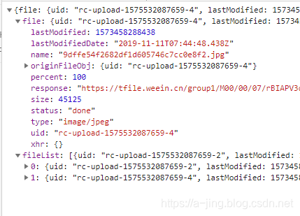每次上传 onChange 回调函数都会执行一次并且里面接收一个JSON对象,其中 file 对象是本次上传的图片信息,status 值为 done 就表示这一次上传成功了,fileList 中是一个数组,里面是组件所有上传的信息列表,每次上传的信息都会记录在里面。