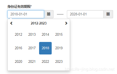 <html><head><meta charset="UTF-8"><link href="https://cdn.bootcss.com/bootstrap/3.3.7/css/bootstrap.min.css" rel="stylesheet"><link href="https://cdn.bootcss.com/bootstrap-datetimepicker/4.17.47/css/bootstrap-datetimepicker.min.css" rel="stylesheet"><script src="https://cdn.bootcss.com/jquery/3.3.1/jquery.js"></script><script src="https://cdn.bootcss.com/bootstrap/3.3.7/js/bootstrap.min.js"></script><script src="https://cdn.bootcss.com/moment.js/2.22.0/moment-with-locales.js"></script><script src="https://cdn.bootcss.com/bootstrap-datetimepicker/4.17.47/js/bootstrap-datetimepicker.min.js"></script><title></title><style type="text/css">.myrow {display: flex;flex-direction: row;/*margin-left:1em;*/}.xxxx {height: 2px;background: #999999;margin-top: 16px;width: 2em;margin-left: 1em;margin-right: 1em;}</style></head><body><div class="form-group "><label for="name">身份证有效期限*</label><div class="myrow"><div class='input-group date' style="width: 14em;" id='datetimepicker1'><input type='text' class="timeInput form-control" /><span class="input-group-addon"><span class="glyphicon glyphicon-calendar"></span></span></div><div class="xxxx"></div><div class='input-group date' style="width: 14em;" id='datetimepicker2'><input type='text' class="timeInput form-control" /><span class="input-group-addon"><span class="glyphicon glyphicon-calendar"></span></span></div></div></div><script>$(function() {$('#form1').hide();var picker1 = $('#datetimepicker1').datetimepicker({format: 'YYYY-MM-DD',locale: moment.locale('zh-cn'),//minDate: '2016-7-1'});var picker2 = $('#datetimepicker2').datetimepicker({format: 'YYYY-MM-DD',locale: moment.locale('zh-cn')});//动态设置最小值picker1.on('dp.change', function(e) {picker2.data('DateTimePicker').minDate(e.date);});//动态设置最大值picker2.on('dp.change', function(e) {picker1.data('DateTimePicker').maxDate(e.date);});});$('#datetimepicker1').datetimepicker({format: 'YYYY-MM-DD',locale: moment.locale('zh-cn'),defaultDate: "2018-1-1"});$('#datetimepicker2').datetimepicker({format: 'YYYY-MM-DD',locale: moment.locale('zh-cn'),defaultDate: "2028-1-1"});</script></body></html>相关文章: