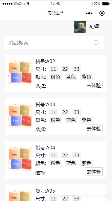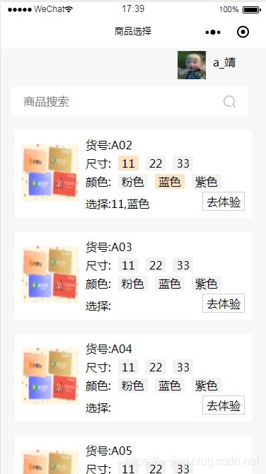 选择商品的属性会显示在下面的选择,点击去体验就把数据传给下一个页面