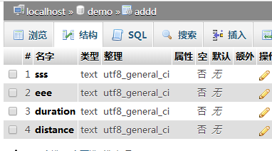 先建数据库, 结构图如下:产数分别是起点地址,终点地址,距离,时间