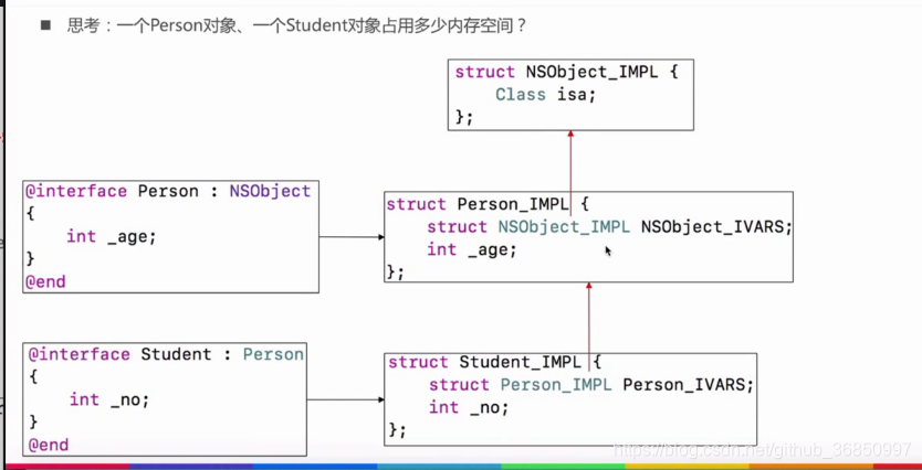 一个 Student 类,继承自NSObject,有两个属性,首先要知道,int 类型占用的字节是4个字节