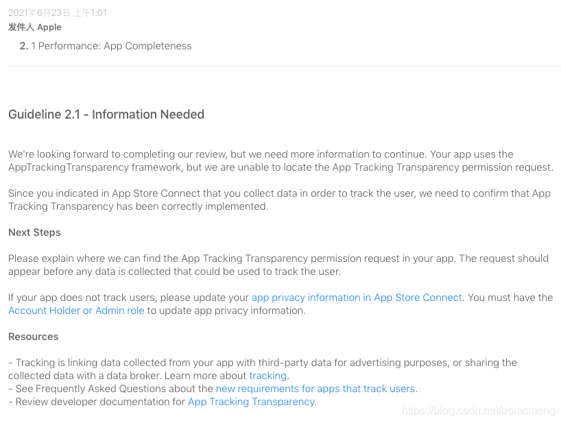 App Tracking Transparency 如果使用了App Tracking Transparency,苹果要求在iOS 14.5及以上的版本中必须在弹框取得用户同意后,才可以跟踪用户。否则会被拒: 解决方案 参照官方文档说明(https://developer.apple.com/documen…