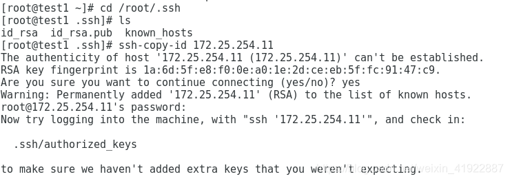 [root@test1 .ssh]# ssh-copy-id 172.25.254.11