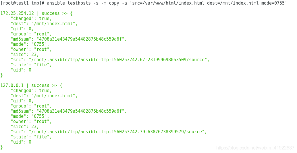 [root@test1 mnt]# ansible all -m command -a "ls -al /mnt/passwd" //此时查看文件存在