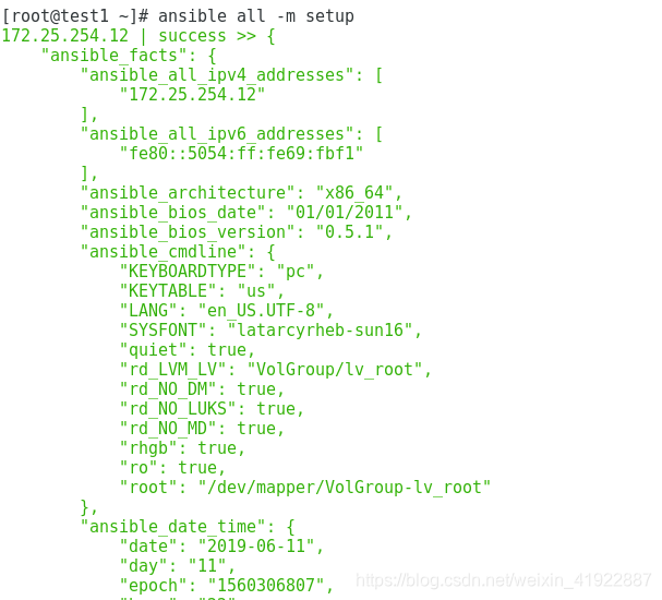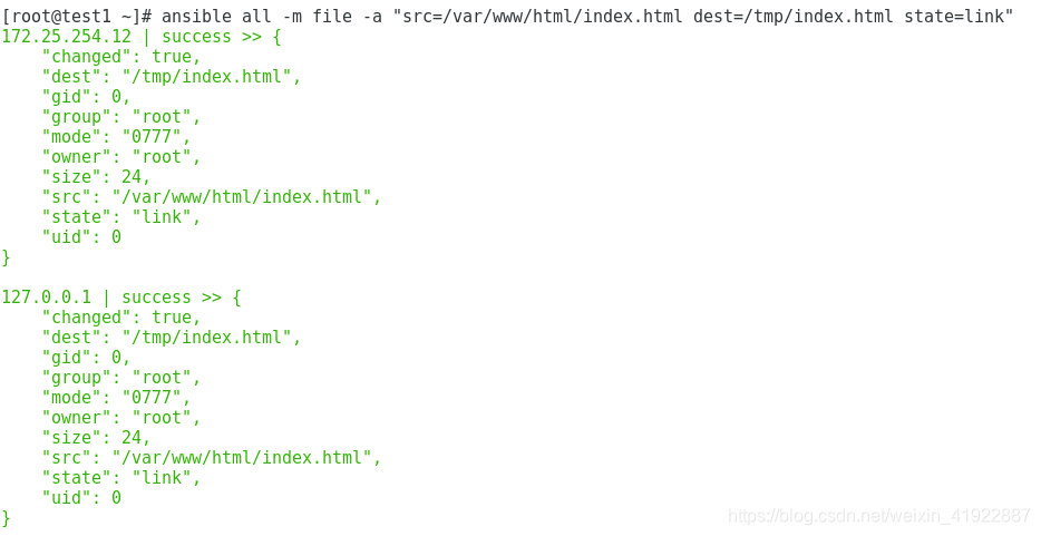 [root@test1 etc]# ansible all -m command -a "ls -al /etc/passwd" //远程文件信息查看