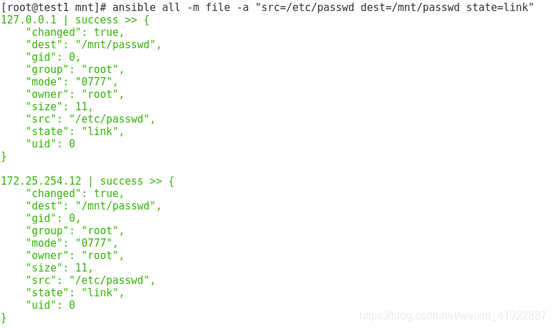 [root@test1 ~]# ansible all -m file -a "src=/etc/passwd dest=/mnt/passwd state=link" //文件链接成功,此时/mnt下有文件passwd