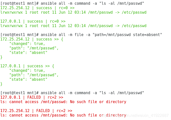 [root@test1 mnt]# ansible all -m command -a "ls -al /mnt/passwd" //查看时报错,说明已经删除