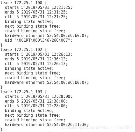 [root@server3 dhcp]# cat /var/lib/dhcpd/dhcpd.leases //可以看到对应的IP给了谁