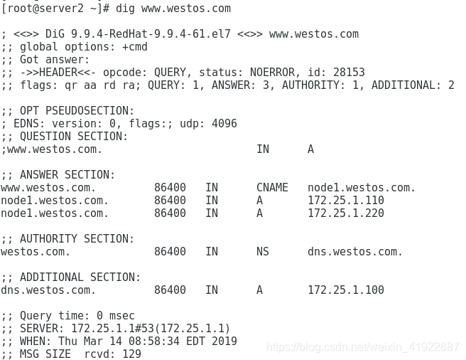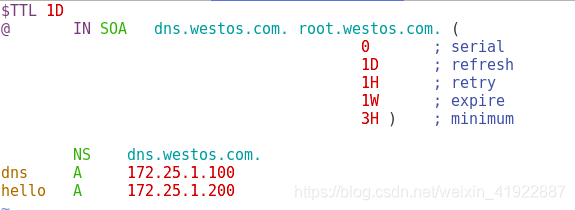 [root@server1 named]# vim westos.com.zone ##编辑域名解析文件