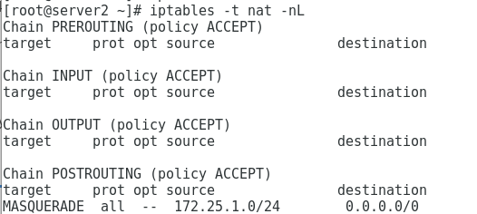 [root@server2 ~]# iptables -t nat -A POSTROUTING -d 172.25.1.1 -j SNAT --to 172.25.1.2