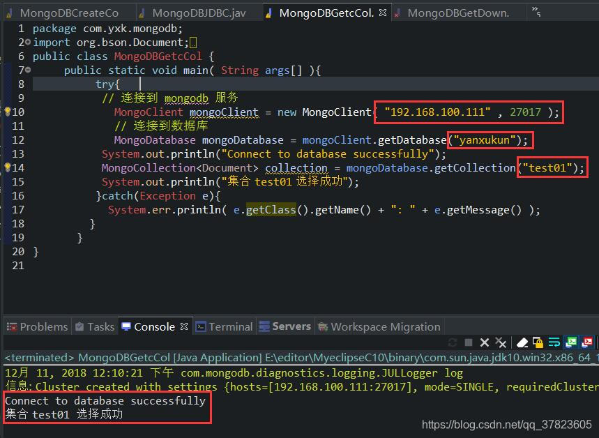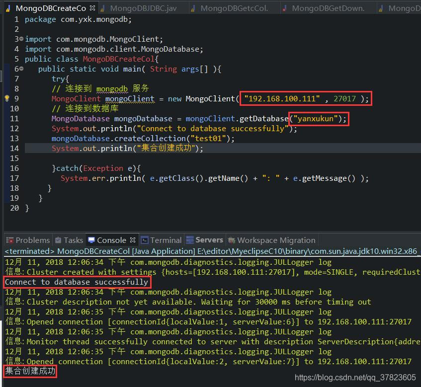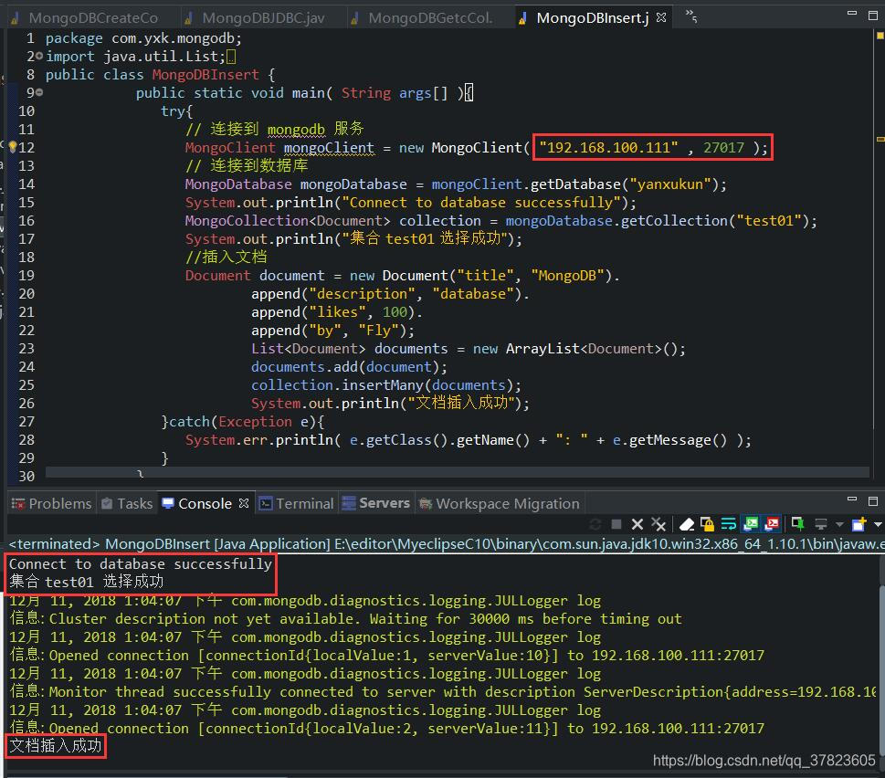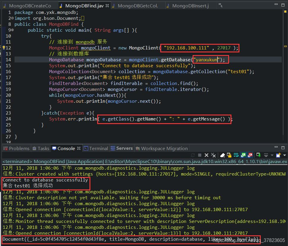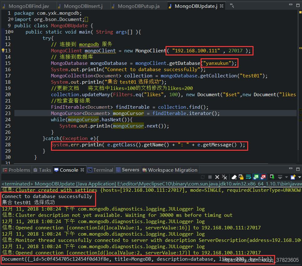 练习一、完成使用Java代码连接MOngoDB,创建集合,获取集合,插入文档,检 索所有文档,更新文档,删除第一个文档。