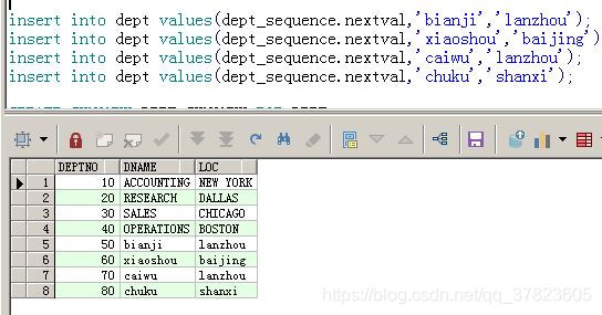 insert into dept values(dept_sequence.nextval,'bianji','lanzhou');