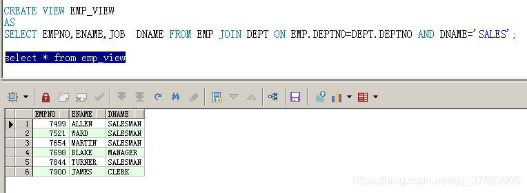 7、创建一个视图包括EMP表的EMPNO,ENAME,JOB,部门表的DNAME列,只能包含销售部的记录。